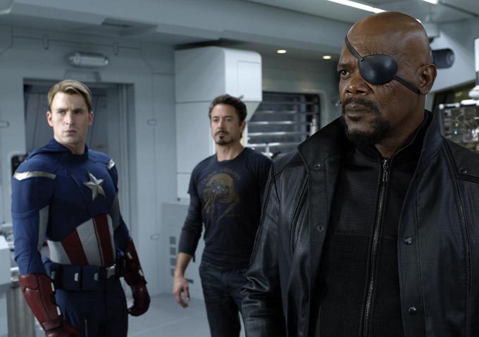The story rounds up Iron Man/Tony Stark (Robert Downey, Jr), Captain America/Steve Rogers (Chris Evans), Thor/Thor (Chris Hemsworth), and the Hulk/Bruce Banner (Mark Ruffalo). They’re recruited to join the national-security agency S.H.I.E.L.D.’s director, eye-patched Bad Mutha Nick Fury (Samuel L. Jackson), his winningly dedicated underling Agent Coulson (Clark Gregg), and S.H.I.E.L.D. agents The Black Widow (Scarlett Johansson) and Hawk(eye) (Jeremy Renner) in their battle with Thor’s brother-gone-bad Loki. (One of the film’s secret weapons, Tom Hiddleston’s Loki is a smirking spoiled brat by way of Richard E. Grant as a Euro-trash alt-rocker).