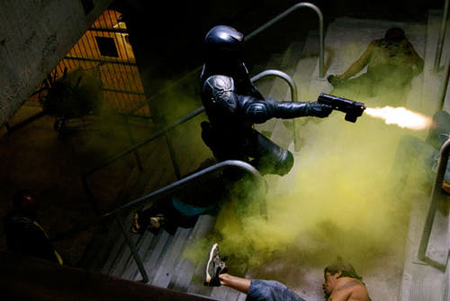 Urban: If you’ve ever read Judge Dredd comics, some of them are extremely graphic, and that graphic content is off-set by that dead-pan humor. The violence in our film is authentic to the what was created by John Wagner and Carlos Ezquerra. What makes the graphic content interesting is the way it’s treated cinemagraphically. The director of photography, Anthony Dod Mantle, came up with a whole treatment for the use of the drug Slo-Mo [a narcotic that slows users’ perception down to 1/100 of real time] that really elevates the material. You’re looking at this graphic violence, but it’s shot so extraordinarily beautiful, it’s like a moving 3D painting. It is reflective of this dangerous, brutal world, of these judges operating in a society that is out of control.