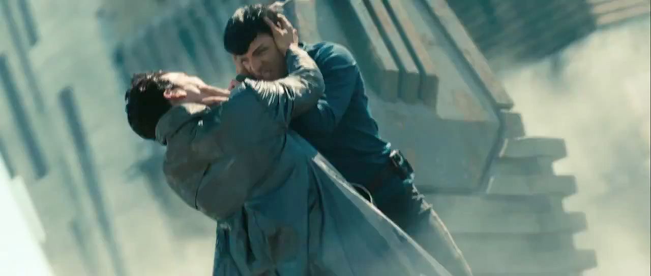 I get that Abrams and screenwriters Roberto Orci, Alex Kurtzman, and Damon Lindelof feel like they’re creating neat-o character symmetry: The reckless, emotion-driven Kirk learns to temper his impulses while logical, cold-blooded Spock gets to cut loose. And I get that this Young Spock has the loss of his mother, his home planet, and almost his entire race weighing on him, but I worry about this tilt from Trek creator Gene Roddenberry’s admirable idealism toward a more cynical, blood-thirsty view of humanity, a move seemingly aimed at a “modern audience” that wants to see its embittered, pain-wracked “heroes” beat the shit out of the bad guys.