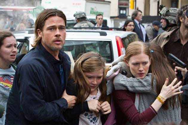 world-war-z-brad-pitt-sterling-jerins-mireille-enosA crackerjack opening has Gerry’s family fleeing the streets of Philly (where the zombie outbreak arrives suddenly and viciously, the fast-moving undead attacking like packs of wild animals) for the collapsing social order of Newark, New Jersey. From there, the film’s second act pinballs around the globe.