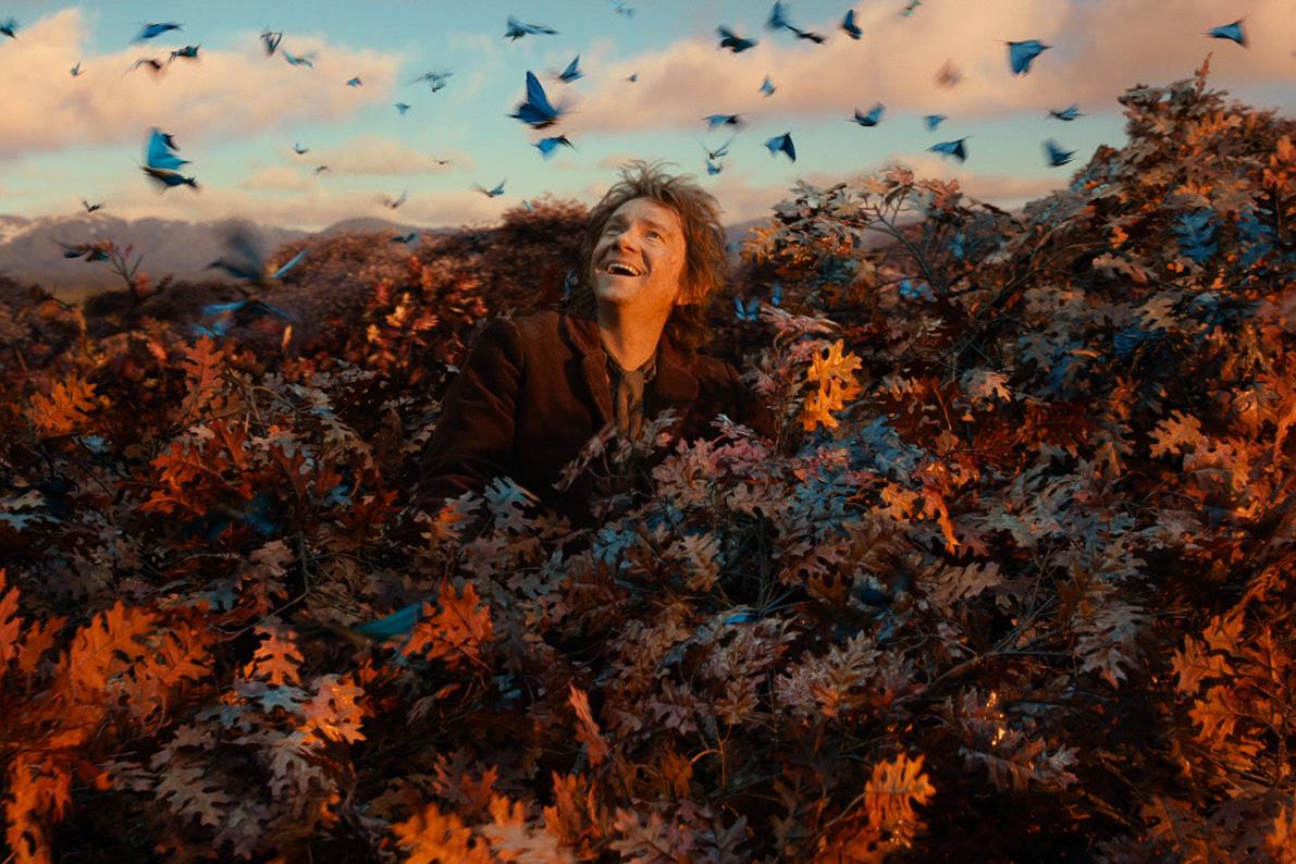 One of the few glimpses of Tolkien’s pastoral humanism that remains in the film version is Bilbo’s climb above the Mirkwood tree canopy where he’s greeted by a fleeting moment in the sun, surrounded by small, fragile butterflies.